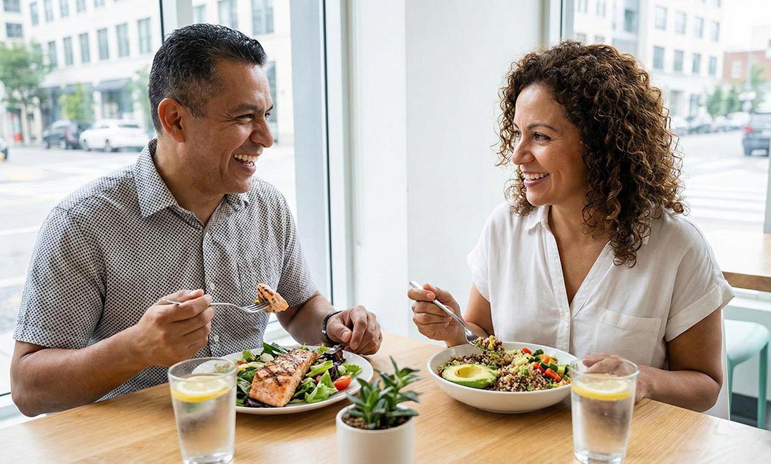 Prefiere proteínas magras y ensaladas con poco aderezo.